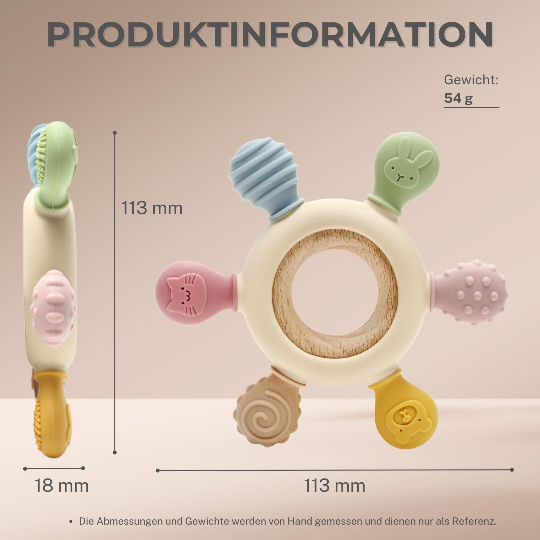 Thanks to its robust material, the teething ring is dishwasher safe , can be refrigerated, or sterilized, and thus remains hygienically clean. The cute animal design makes teething more pleasant and makes a lovely gift for a new baby, baby shower, or birthday.