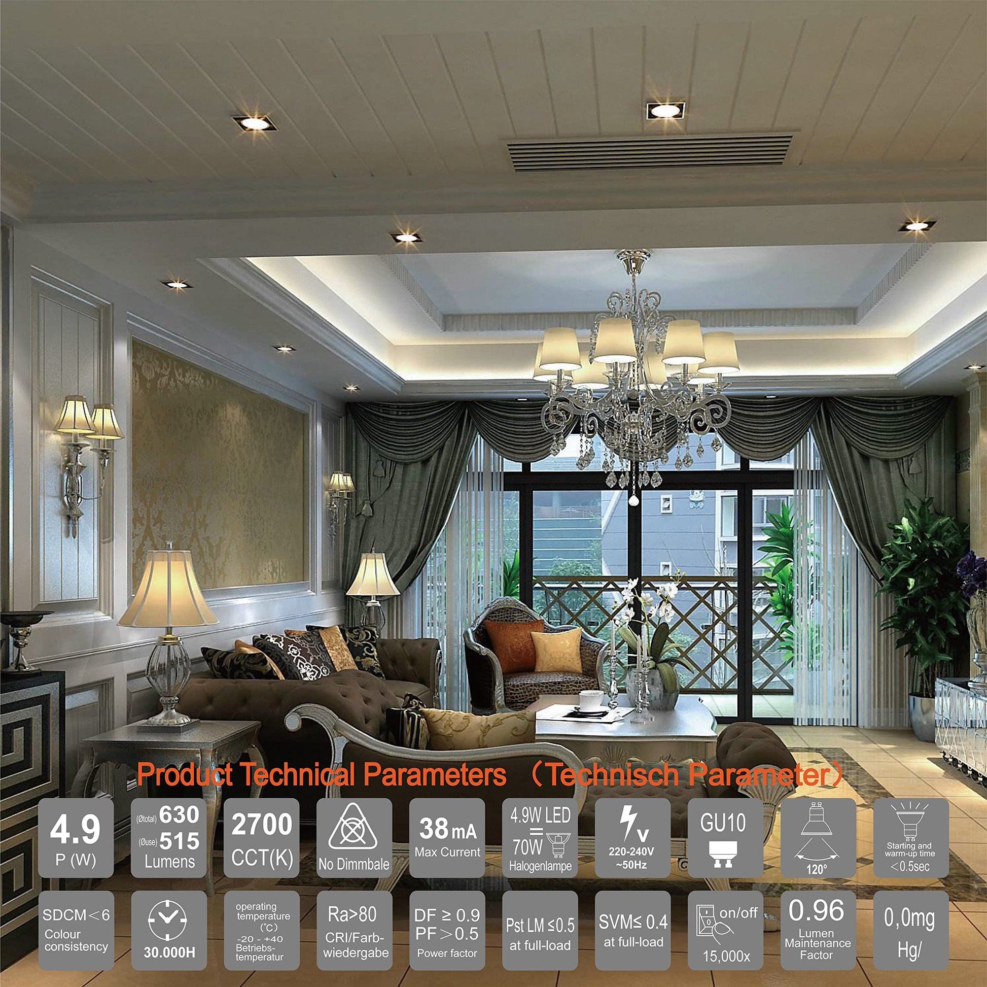 The EACLL GU10 LED lamps (4.9W) produce a warm white 2700K light with instant brightness and excellent color rendering (CRI > 80) .