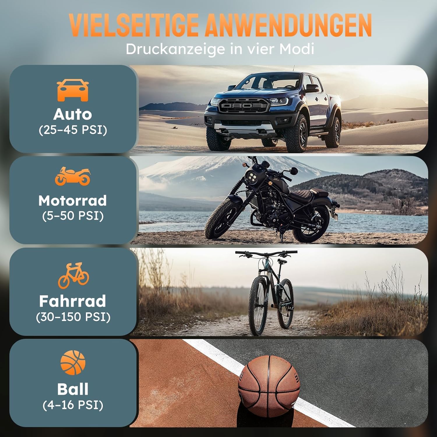Versatile application: 4 preset modes for car, bicycle, motorcycle & ball - automatic switch-off when the pressure is reached