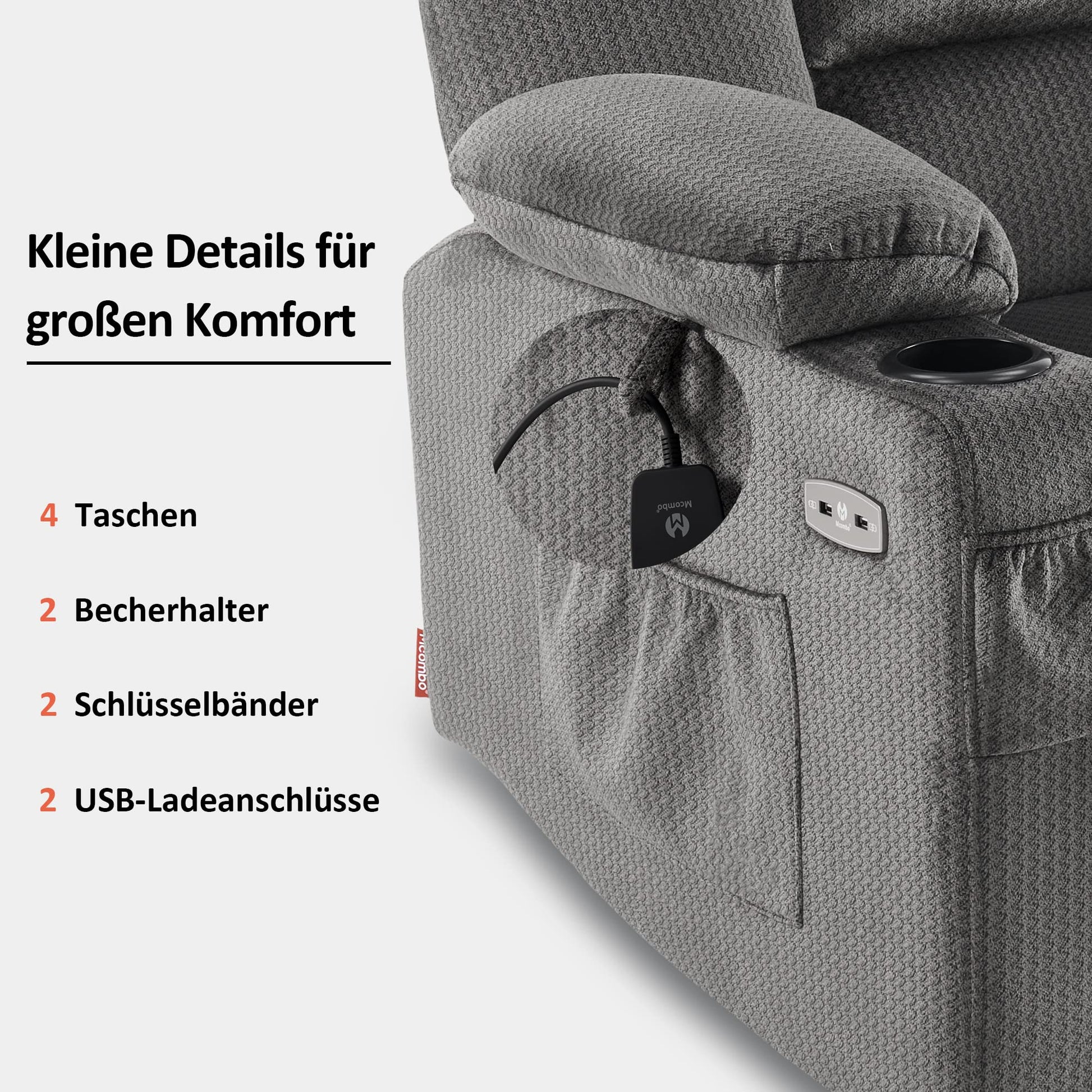 M MCombo TV recliner (7008) with reclining, massage and heat function: Electrically adjustable, USB & cup holder in grey