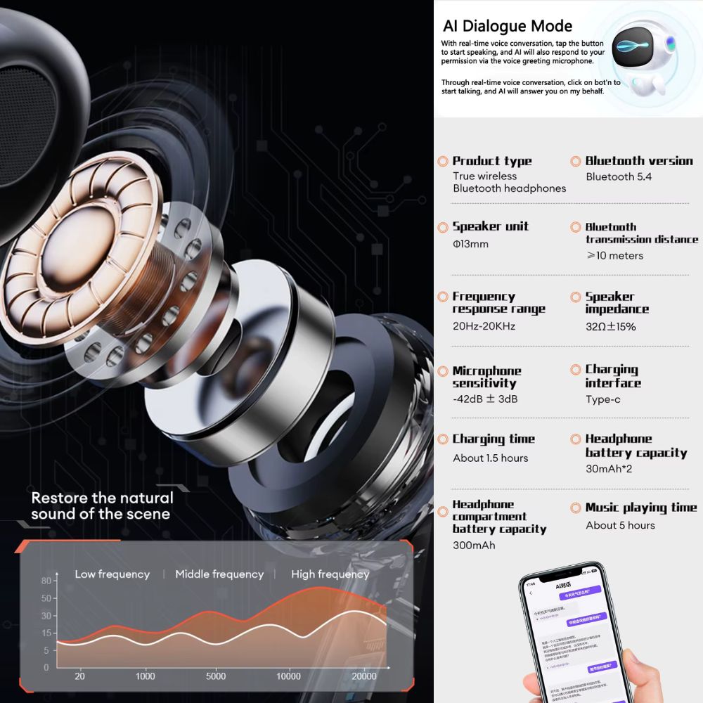 Traduction simultanée & mode face à face : Idéal pour les conversations directes ou les réunions. L'IA analyse la parole en temps réel et transmet la traduction directement via les écouteurs.
