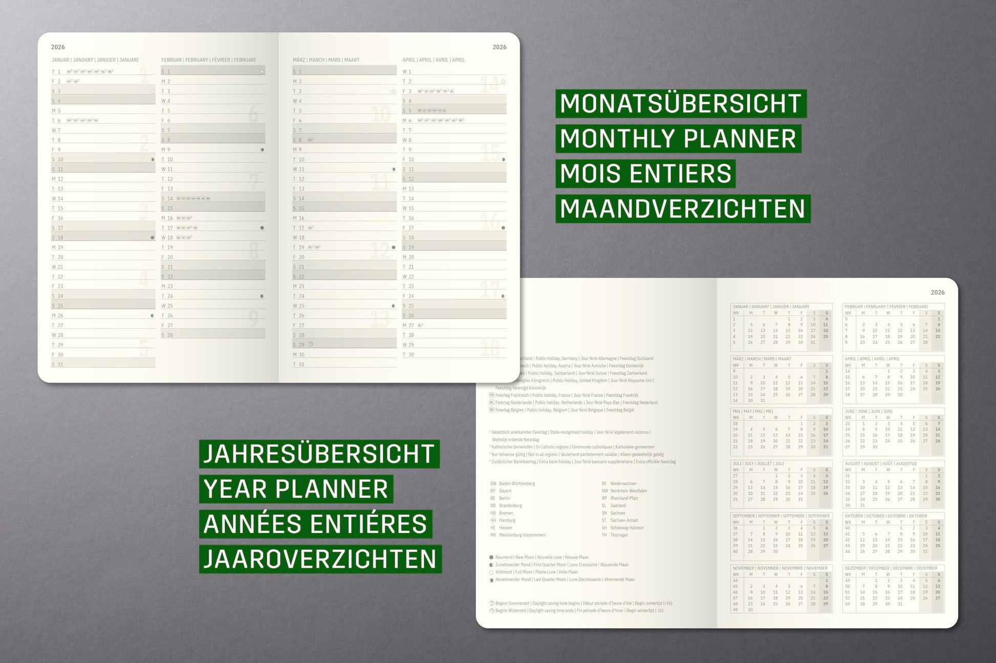 - Kalendarium: 1 Woche auf 2 Seiten + separate Notizspalte