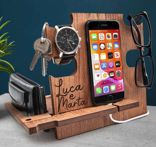 Dockingstation personalisiert: Vatertagsgeschenk, Organizer aus Holz mit Gravur für Papa