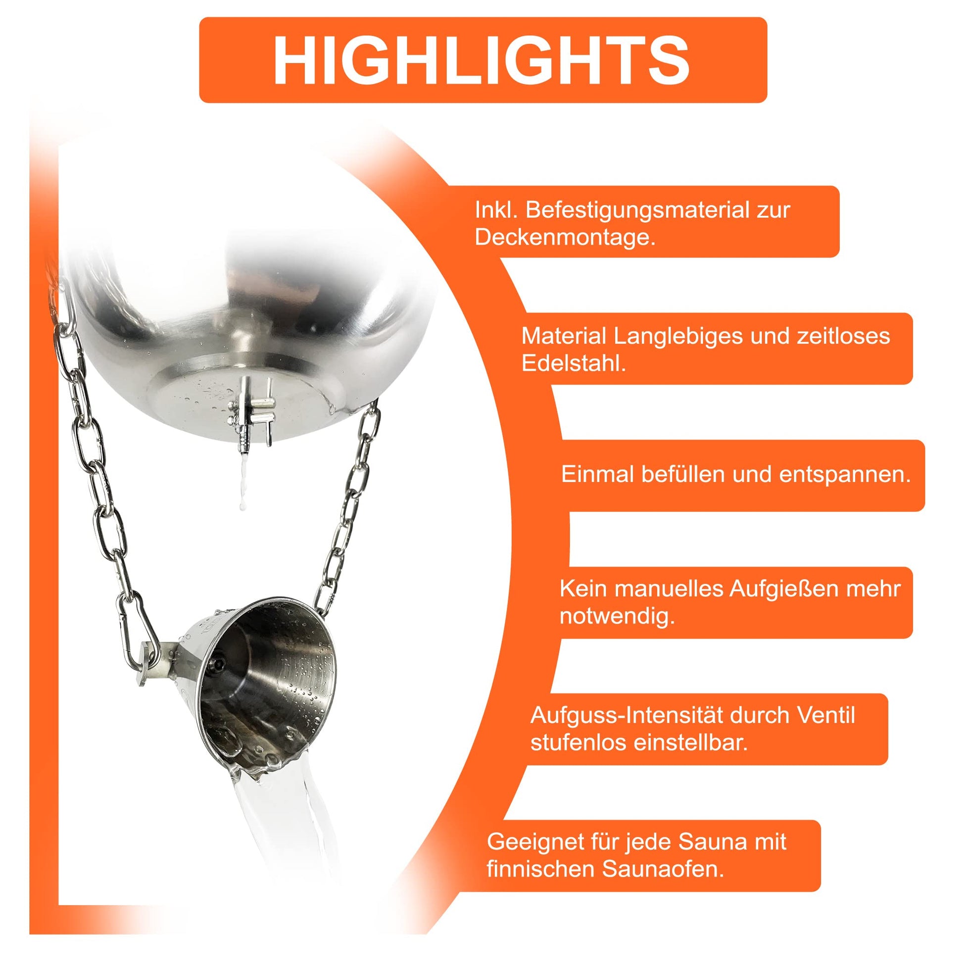 - Aufgussfrequenz: 10-20 automatische Aufgüsse bei voll geöffnetem Ventil (ca. 8-10 Minuten)