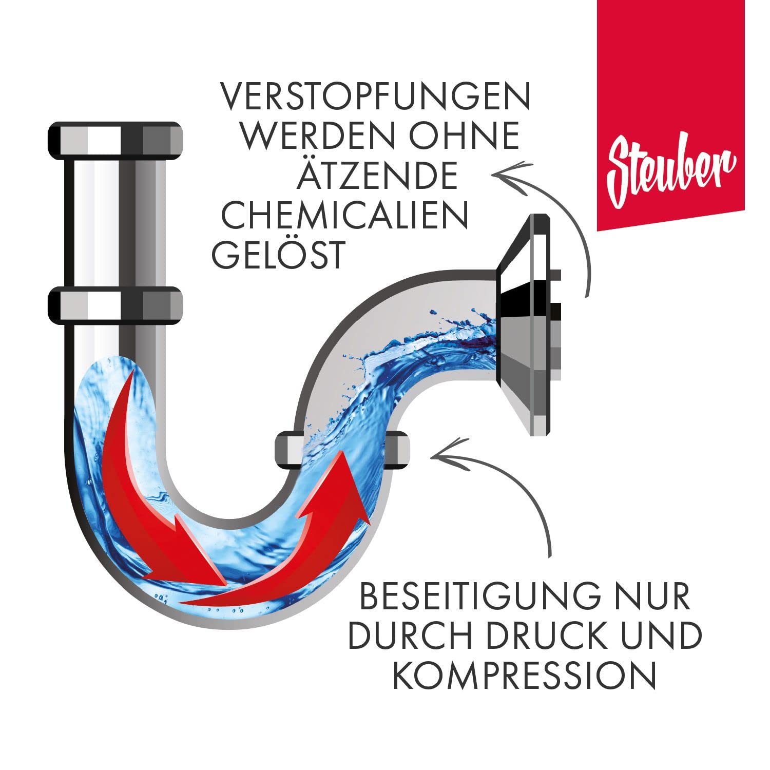Der Steuber Abflussreiniger beseitigt Verstopfungen in Sekundenschnelle - ganz ohne aggressive Reinigungsmittel. Die Reinigung erfolgt ausschließlich durch Druck und Kompression und ist damit umweltschonend und sicher für Rohre und Leitungen.