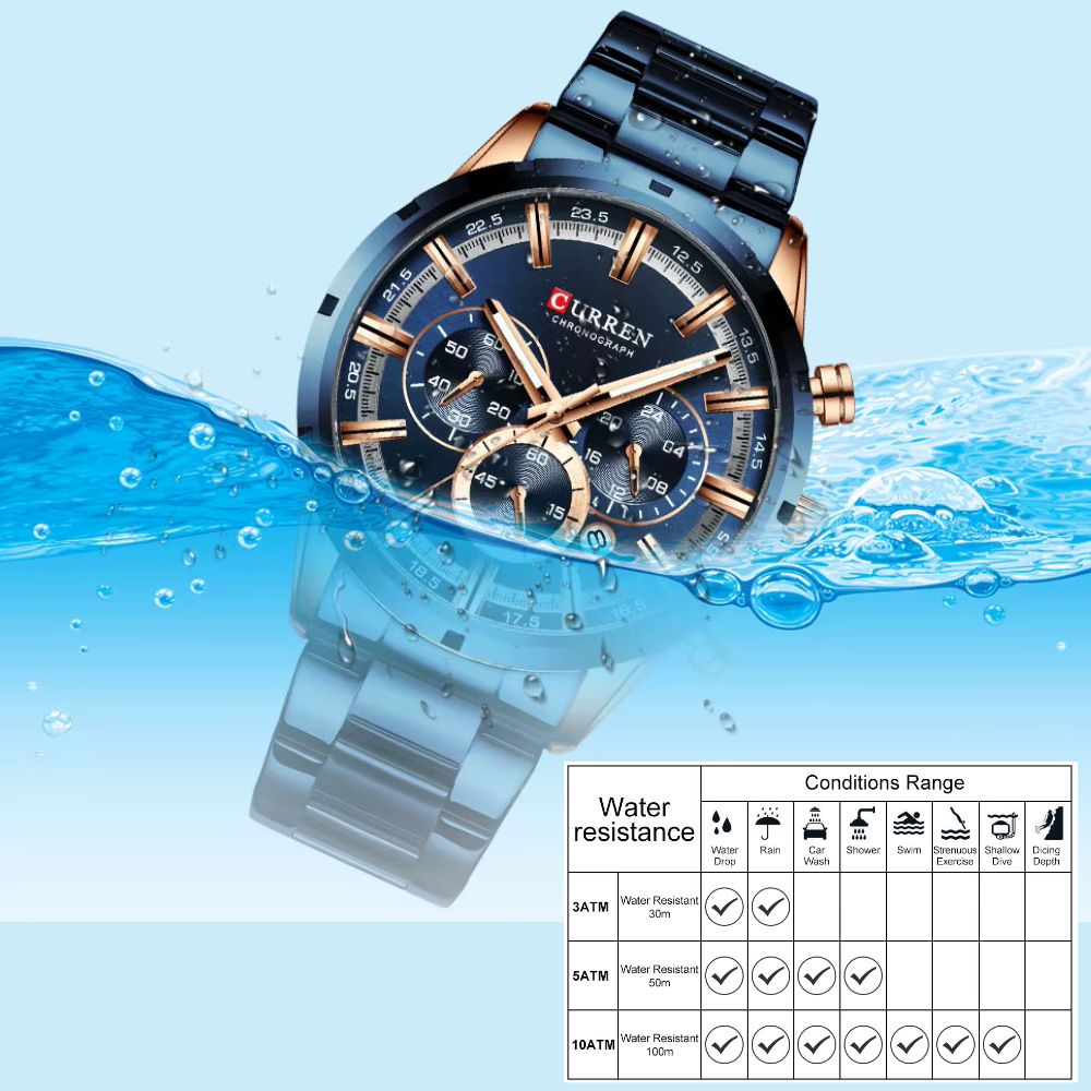 3 ATM wasserdicht: Beständig gegen Spritzwasser und Händewaschen (nicht geeignet für Duschen, Baden oder Schwimmen).