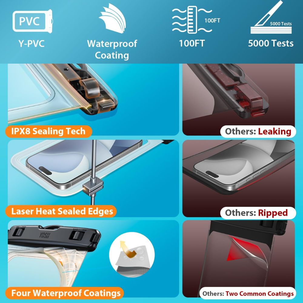 Ausgezeichnete IPX8-zertifizierte Wasserdichtigkeit: Jede Hülle wird vor dem Versand 30 Minuten lang in 30m Tiefe getestet. Tipp: Vor dem Einsatz mit einem Tuch testen.