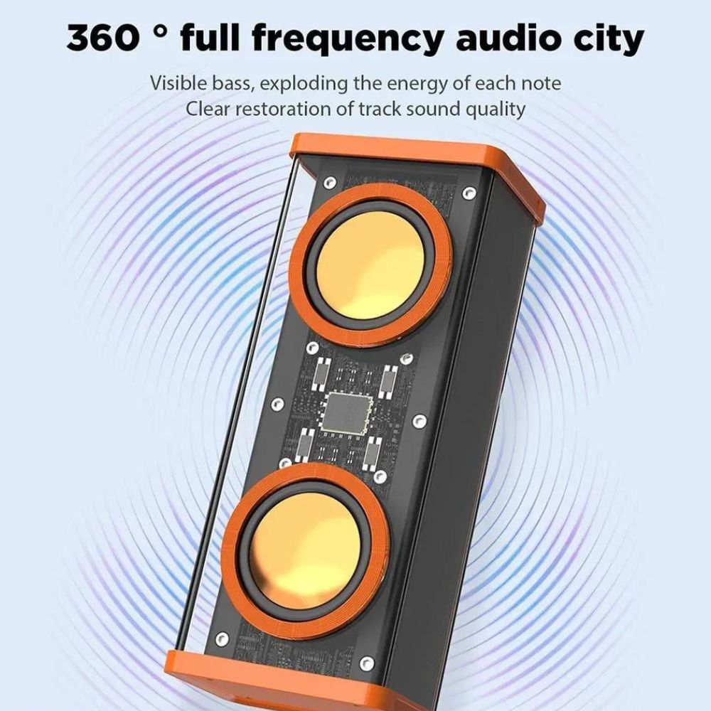 Der transparente Mecha TWS Bluetooth-Lautsprecher bietet 360° Panorama-Soundeffekte und bewegliches Licht, das sich mit dem Ton synchronisiert und die Musik in ein audiovisuelles Erlebnis verwandelt.