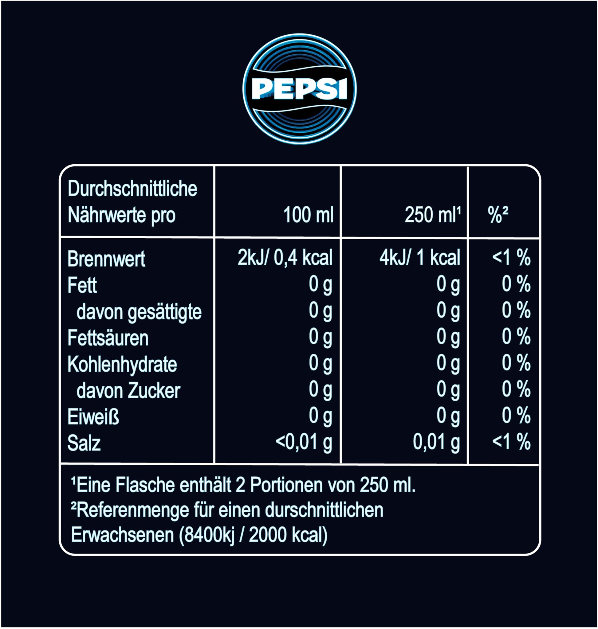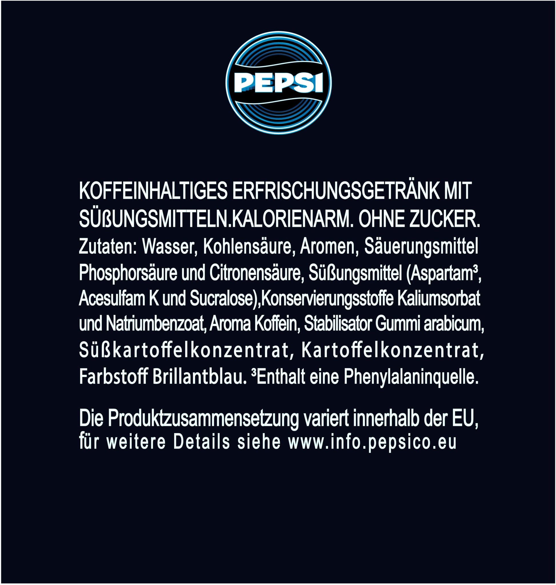 Zutaten: Wasser, Kohlensäure, Aromen, Säuerungsmittel (Phosphorsäure, Citronensäure), Süßungsmittel (Aspartam³, Acesulfam K, Sucralose), Konservierungsstoffe (Kaliumsorbat, Natriumbenzoat), Koffein, Stabilisator Gummi arabicum, Subkartoffel- und Kartoffelkonzentrat, Farbstoff Brillantblau. ³Enthält eine Phenylalaninquelle.